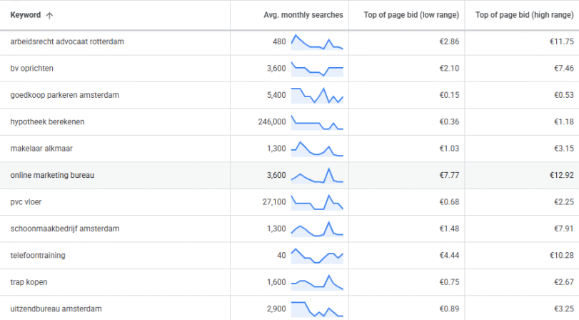 Google AdsKosten van kliks kunnen wij inzien in de keyword planner van Google. We kijken op basis van keyword onderzoek naar de geschatte kosten die in de planner staan. De daadwerkelijke kosten zijn zeer afhankelijk van een groot aantal factoren.