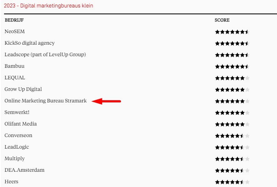 Top 3 positie Online Marketing Bureau Stramark in 2022, 2023, 2024 en 2025